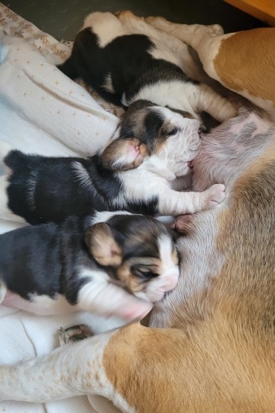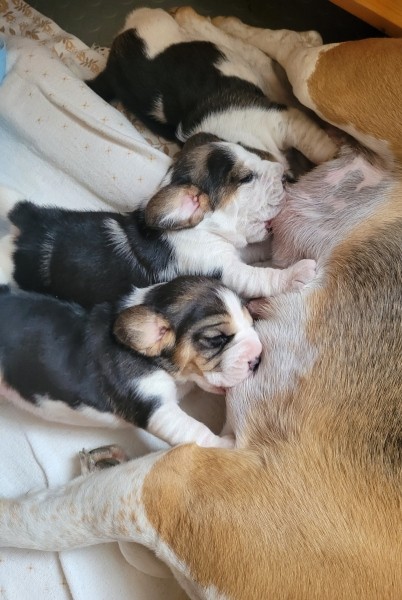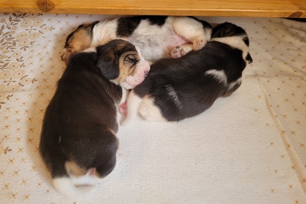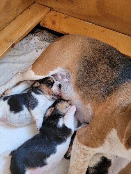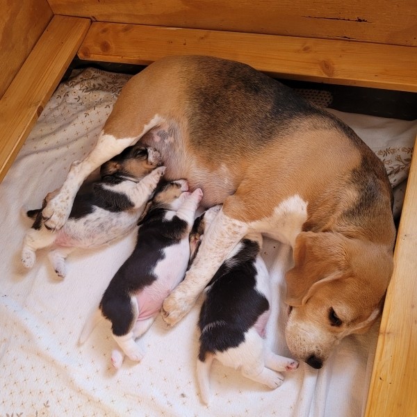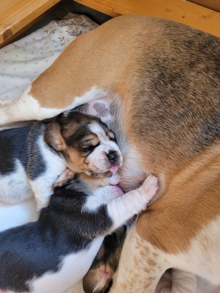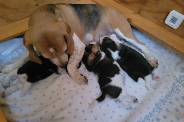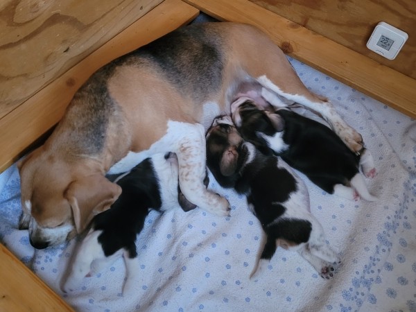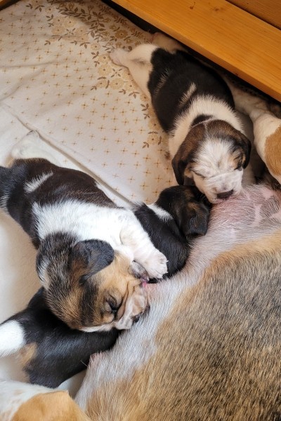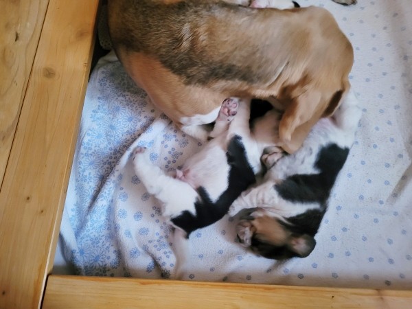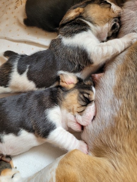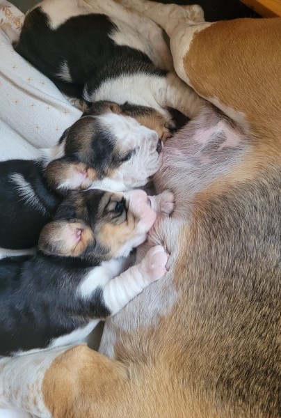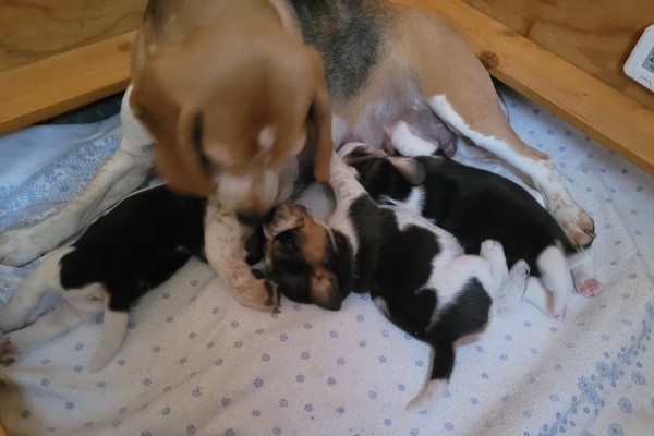 Unsere Lieblingsbeschäftigungen sind weiterhin das Trinken an Mamas Milchbar und schlafen. Wir "entdecken" unsere Geschwister und versuchen, zu laufen.