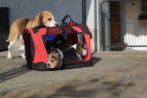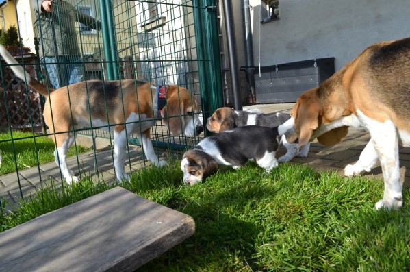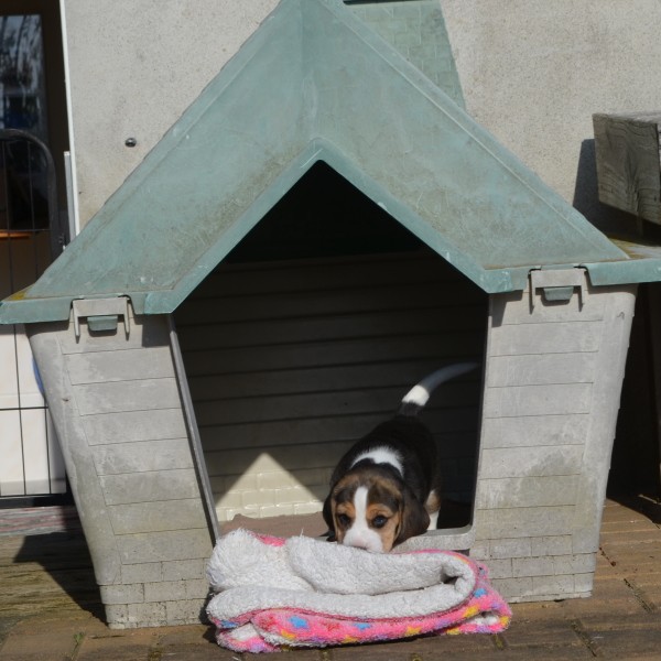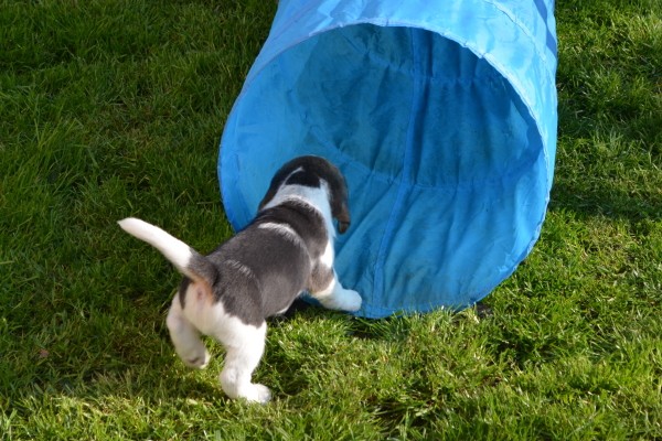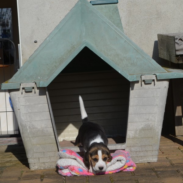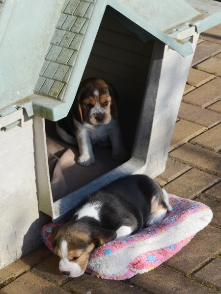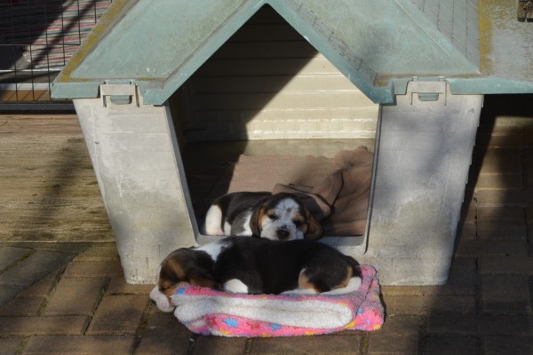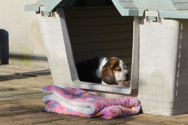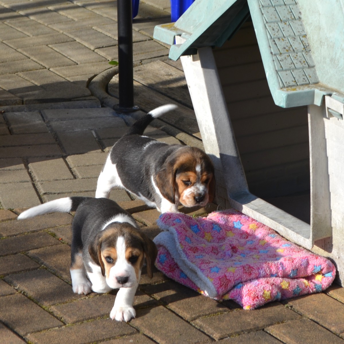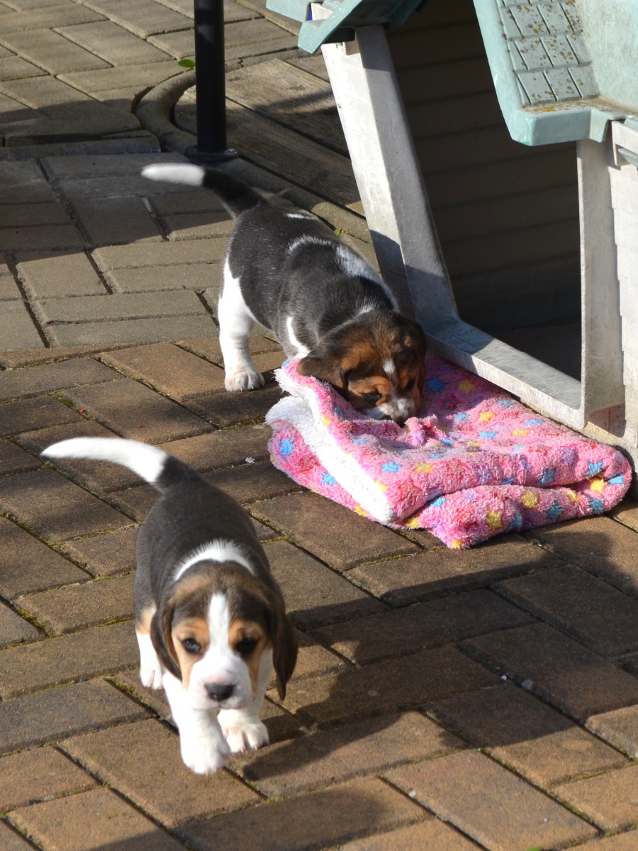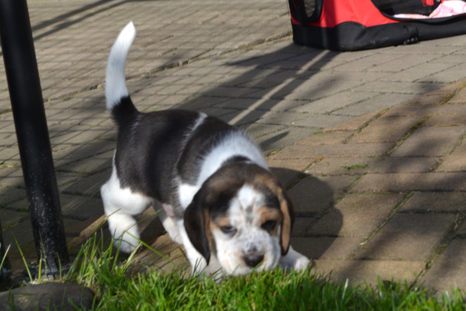 Am Freitagnachmittag haben wir ein großes Abenteuer erlebt. Gemeinsam mit unserer Mama, die ganz sehr auf uns aufgepasst hat, waren wir bei schönem warmen Wetter zum ersten Mal im Garten. Da gab es eine Menge zu entdecken. Queenie Emma hat die Hundehütte entdeckt. Die ist prima und später haben wir ein Nickerchen darin gemacht. Quentin Bruno hat sich zuerst in den großen blauen Tunnel getraut. Und wir haben natürlich vom Gras gekostet, zuerst Queen Buffy und dann auch die beiden anderen. Das musste sein! Das war herrlich im Garten. Nach dem Schlafen waren unsere Batterien wieder aufgeladen und wir gingen weiter auf Entdeckungstour. Später gab es Milch bei Mama Kaley und dann haben wir mit ihr zusammen ein weiteres Schläfchen gemacht.