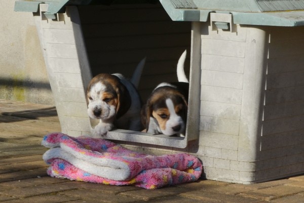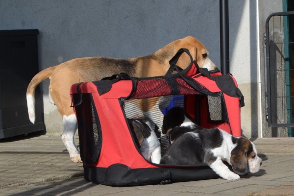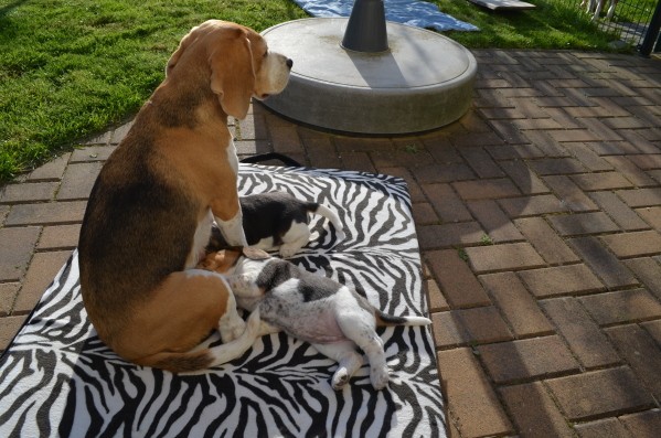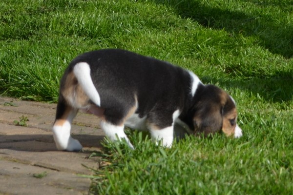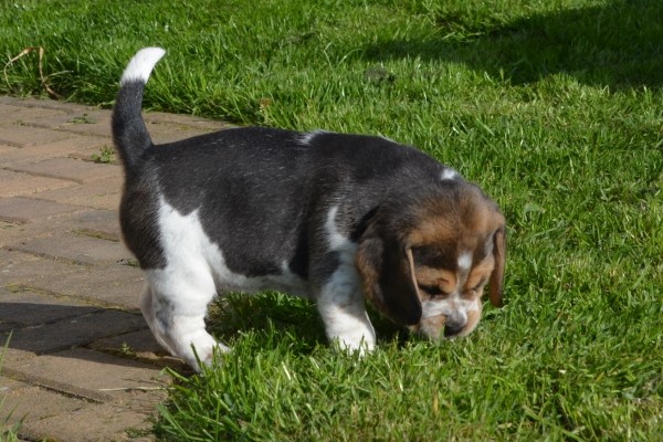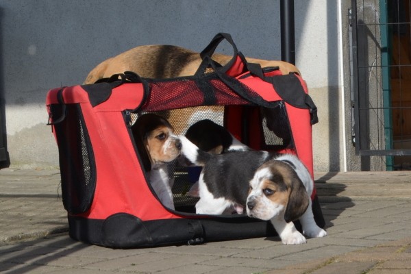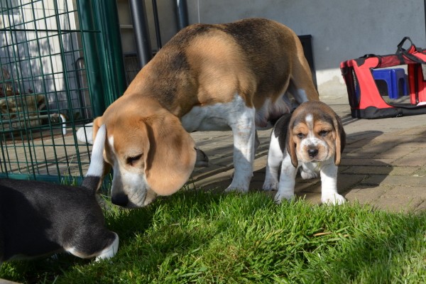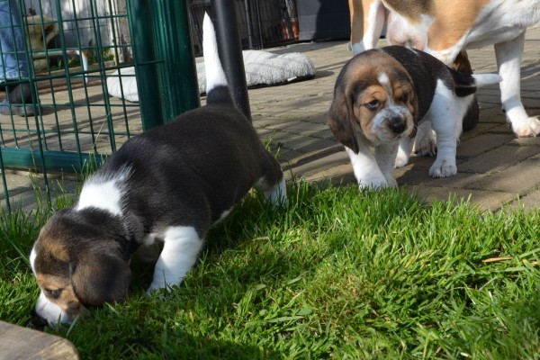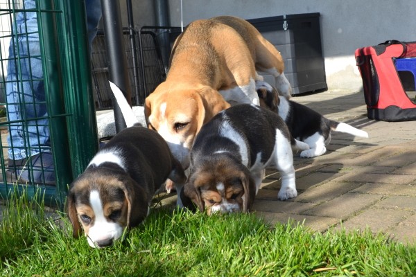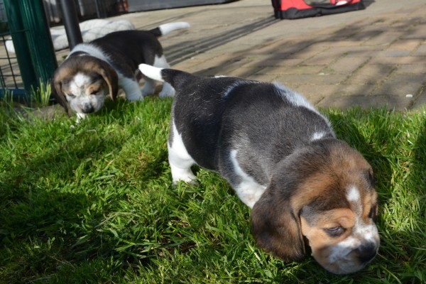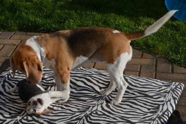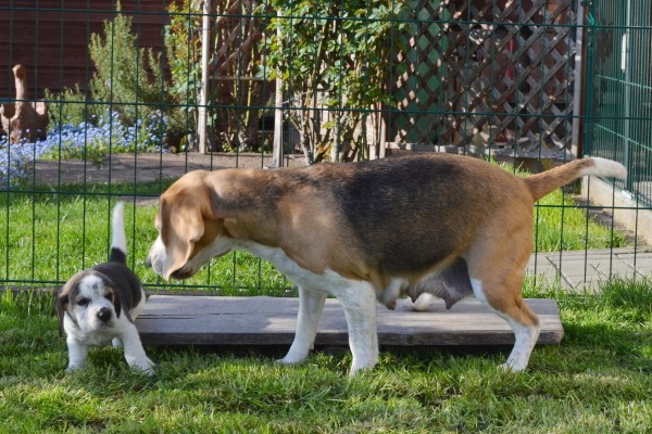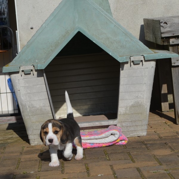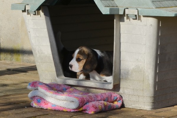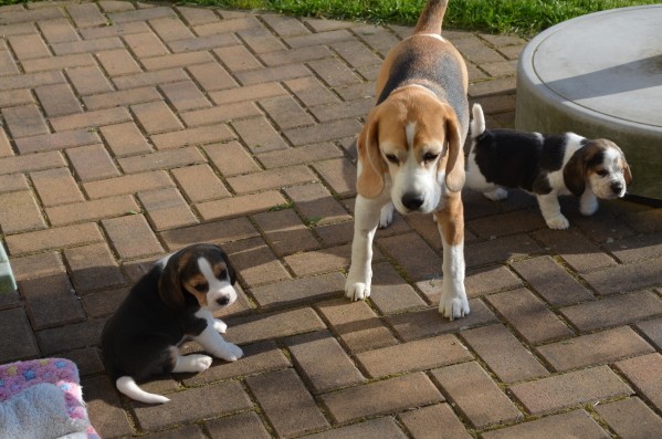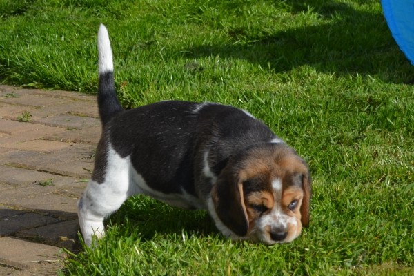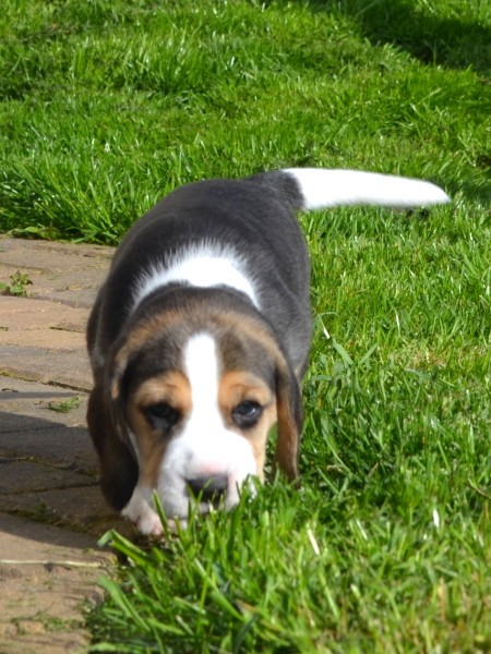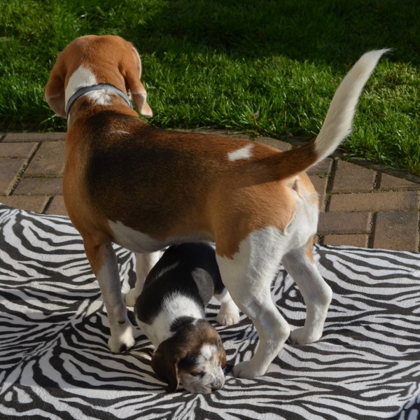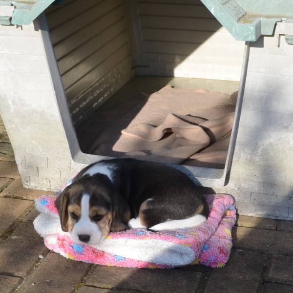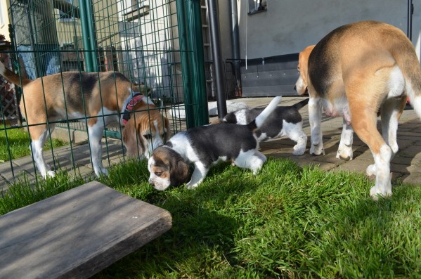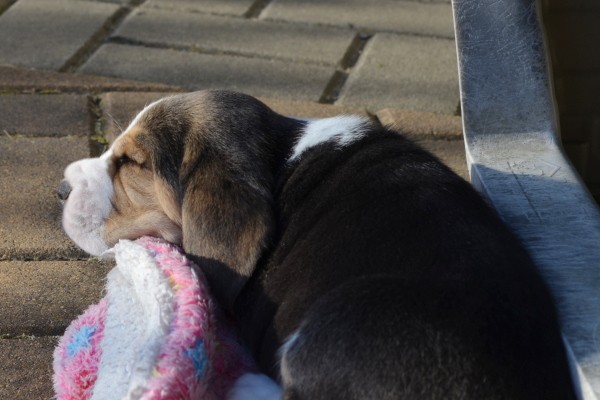 Am Freitagnachmittag haben wir ein großes Abenteuer erlebt. Gemeinsam mit unserer Mama, die ganz sehr auf uns aufgepasst hat, waren wir bei schönem warmen Wetter zum ersten Mal im Garten. Da gab es eine Menge zu entdecken. Queenie Emma hat die Hundehütte entdeckt. Die ist prima und später haben wir ein Nickerchen darin gemacht. Quentin Bruno hat sich zuerst in den großen blauen Tunnel getraut. Und wir haben natürlich vom Gras gekostet, zuerst Queen Buffy und dann auch die beiden anderen. Das musste sein! Das war herrlich im Garten. Nach dem Schlafen waren unsere Batterien wieder aufgeladen und wir gingen weiter auf Entdeckungstour. Später gab es Milch bei Mama Kaley und dann haben wir mit ihr zusammen ein weiteres Schläfchen gemacht.